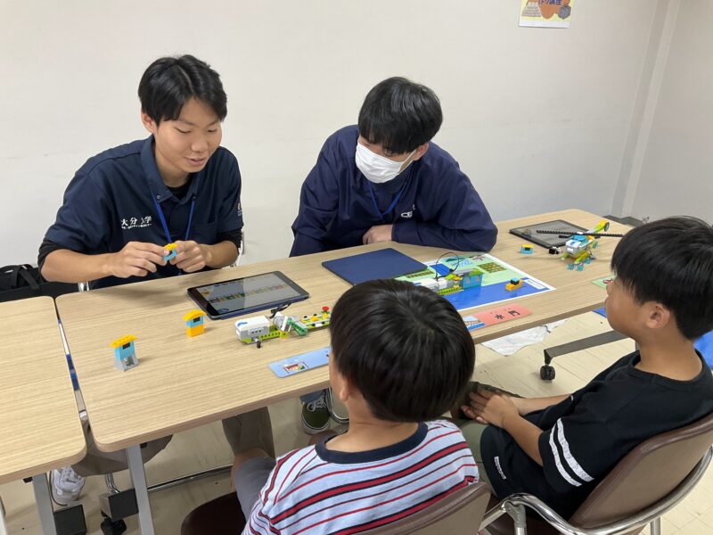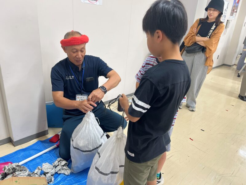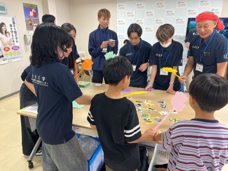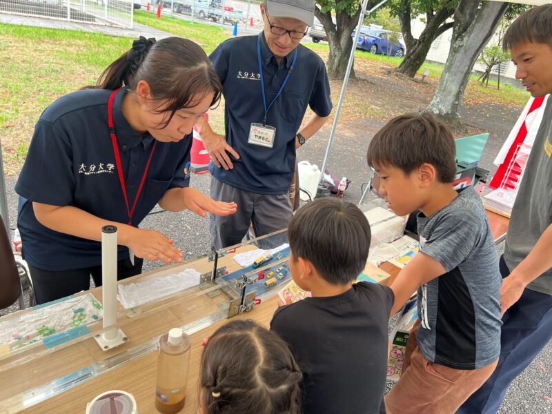 駐車場では、手作り感満載の火山噴火実験やブロックで作ったダムによる流域治水を学ぶブース、津波や液状化実験,竜巻発生装置や熱赤外線装置など気象や防災に関する「実験コーナー」が並びました。室内では「空気砲」や「ドローンシミュレーター」「防災VR」「防災ブロックプログラミング」、そして「おおいた減災かるた」「土のうつくり」「新聞スリッパ」の体験コーナーがあり、多くの子どもたちが楽しんでくれました。また、会場の入口では、誕生日の天気図を顔写真入りで印刷してくれるコーナーや,令和6年1月1日に発生した能登半島地震の被災地での学生CERDによる支援活動について紹介するなど様々なコーナーが準備されており、子どもたちにとって気象や科学、そして防災に触れる有意義な一日となりました。